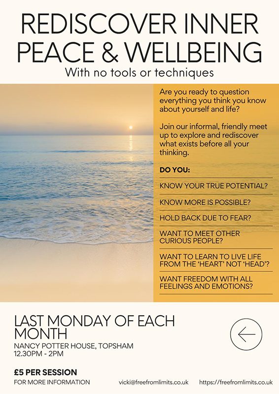 Rediscover Inner Peace & Wellbeing + Add to Google Calendar + iCal / Outlook export 00 days 00 hours 00 minutes 00 seconds November 2025 Nov 12 - 23 2025 Hospiscare’s Garden of Light Darts Farm Nov 24 2025 Rediscover Inner Peace & Wellbeing Nancy Potter House Nov 25 2025 Estuary Players: See How They Run Matthew’s Hall, Fore Street, Topsham Nov 26 2025 Estuary Players: See How They Run Matthew’s Hall, Fore Street, Topsham No event found! Load More